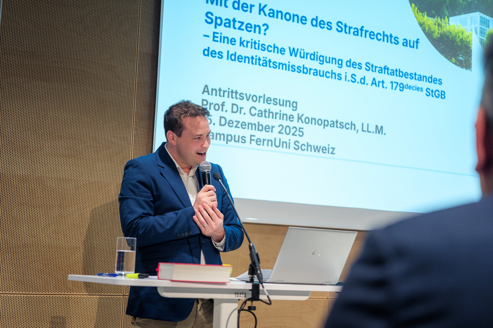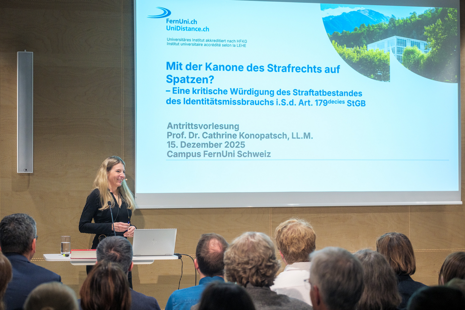 Professor Konopatsch also examined the significance of the offence of identity misuse and its application in practice, drawing on an analysis of convictions under Art. 179decies of the Swiss Criminal Code in 2024. Using concrete case studies, she demonstrated the broad scope of the offence, which raises critical concerns in particular with regard to the principle of legal certainty and the ultima ratio principle. In doing so, she returned to the title of her inaugural lecture, “Mit der Kanone des Strafrechts auf Spatzen?” (in English “Using the Cannon of Criminal Law to Shoot Sparrows?”). In her concluding remarks, Professor Konopatsch advocated, de lege ferenda, for a restriction and further specification of Art. 179decies of the Swiss Criminal Code.