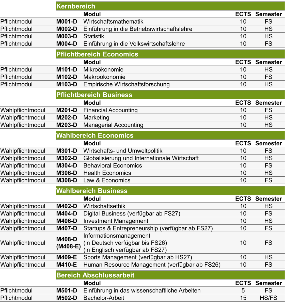 Begleitend zum Major-Programm Business oder Economics, muss verpflichtend ein Minor-Programm gewählt werden. Hierbei kann aktuell zwischen folgenden Minor-Programmen gewählt werden: