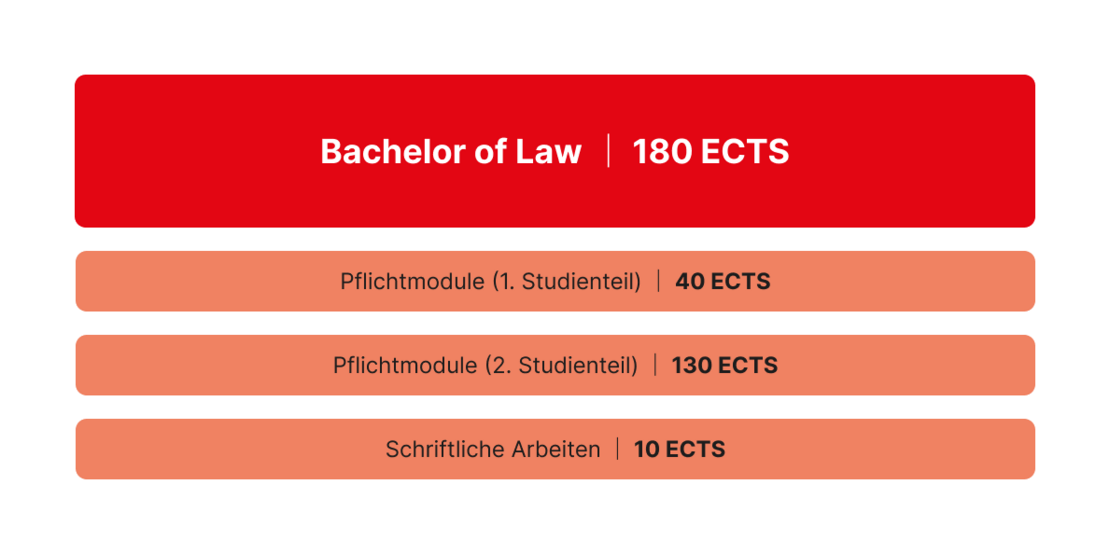 Der Studiengang beinhaltet 18 Module (2 pro Semester). Der Abschluss Bachelor of Law umfasst somit 180 ECTS-Punkte.