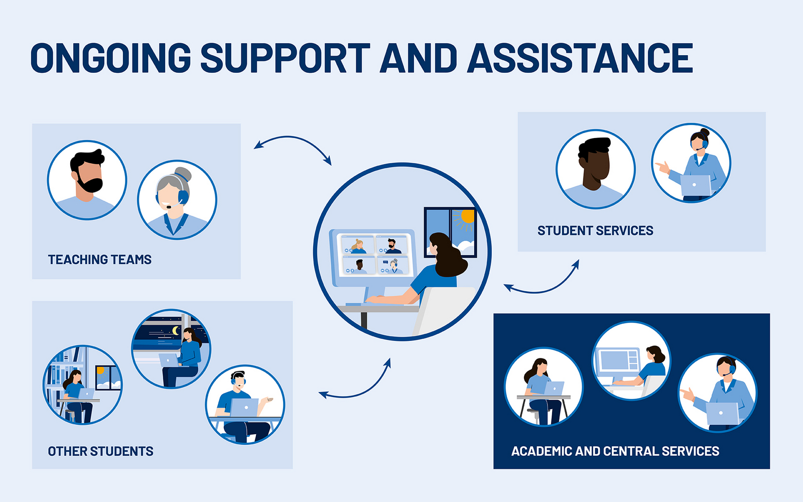 Support and assistance are provided, in particular via regular class sessions and continuous assessment of knowledge.