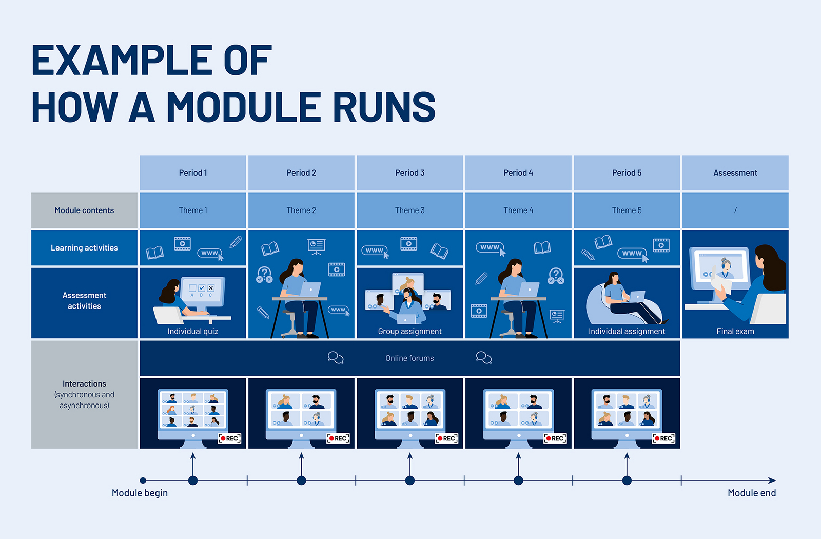 The online class sessions (videoconferences on Zoom) offer opportunities to meet up and discuss things with other students and the teaching team. They are held approximately once a month (generally on Saturdays) and ensure regular learning. These moments of interaction are an integral part of the teaching concept: they help you deepen your understanding of the material, examine specific cases and complete exercises as a group. The class sessions are generally recorded and made available to students undertaking the module.