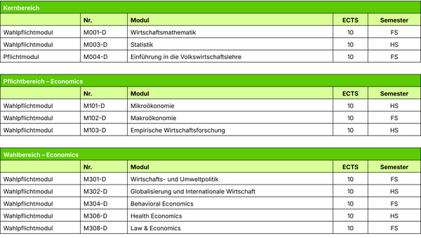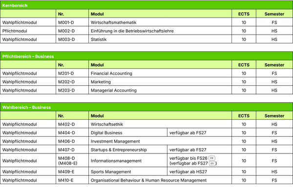 En règle générale, deux modules sont suivis par semestre, qui comprend 14 semaines de cours, tant au semestre d’automne qu’au semestre de printemps. Il en résulte un temps de travail approximatif de 25 à 30 heures par semaine, que les étudiant-e-s peuvent répartir individuellement. La durée totale des études est en moyenne de 4,5 ans.