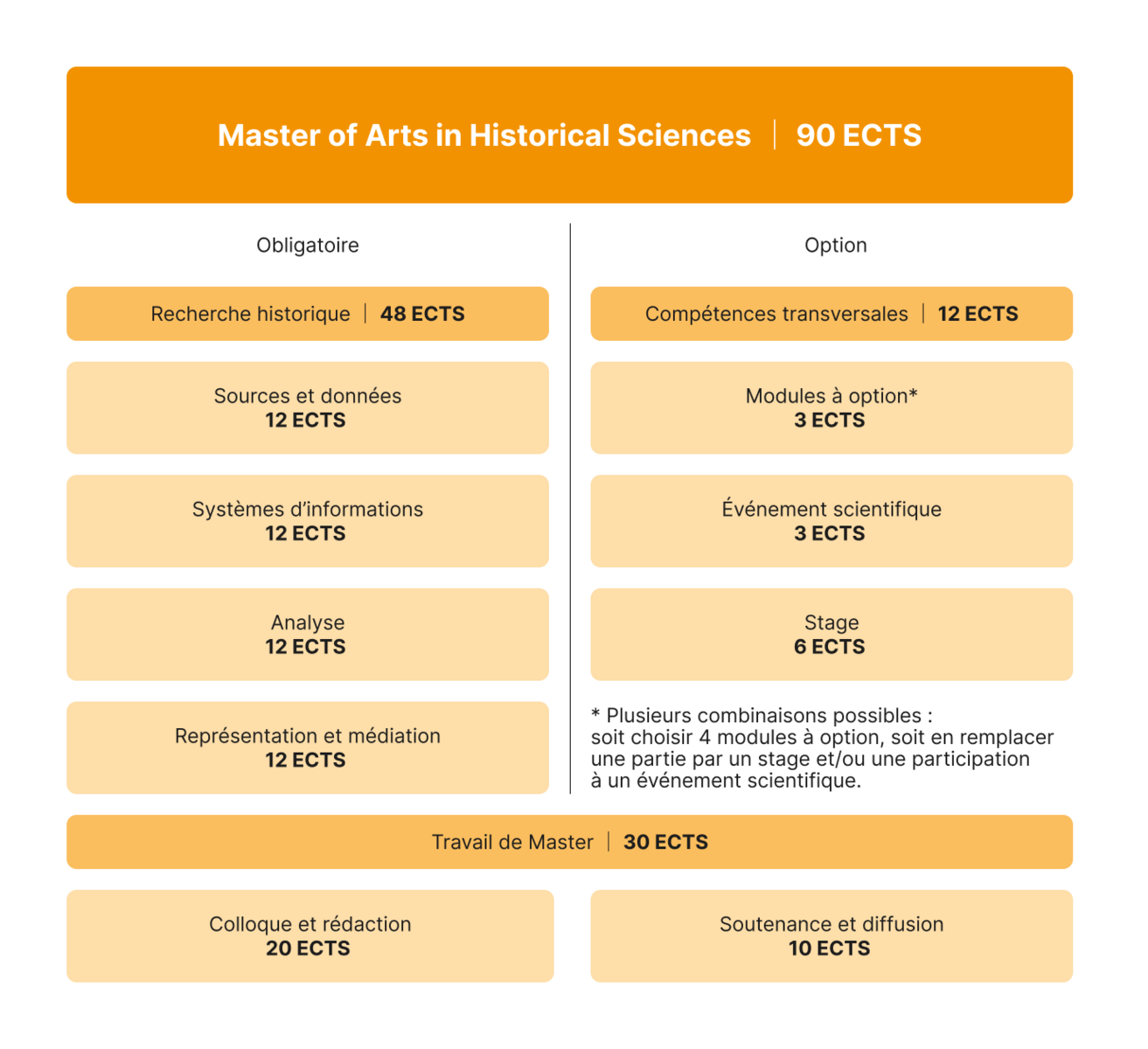 - Le deuxième bloc comprend divers modules à option, des stages et des événements scientifiques (12 ECTS)